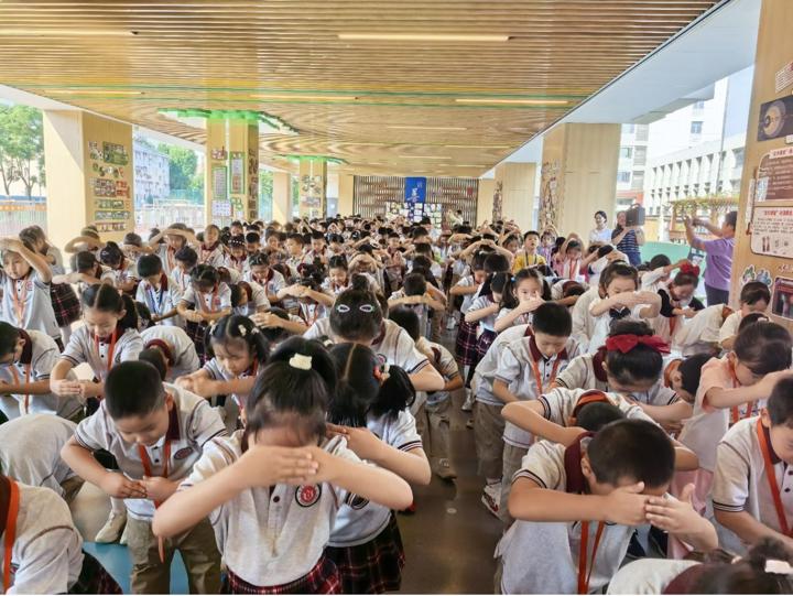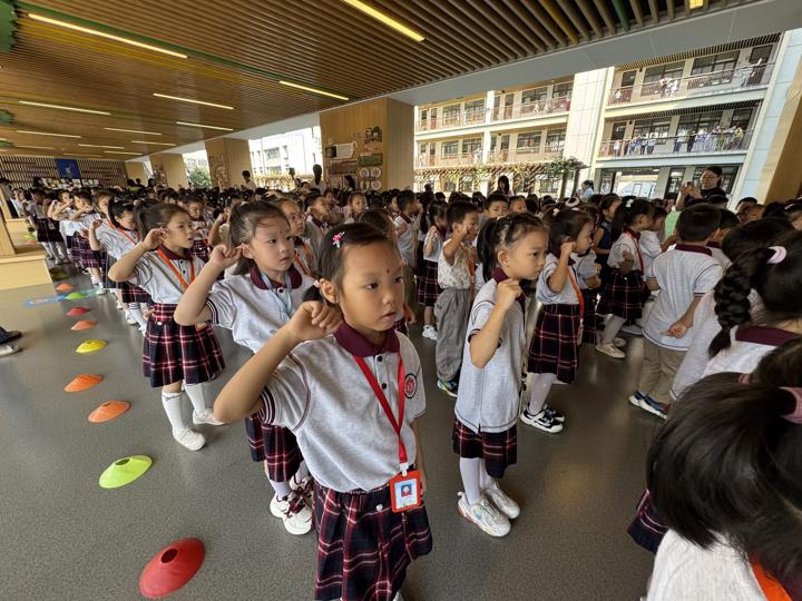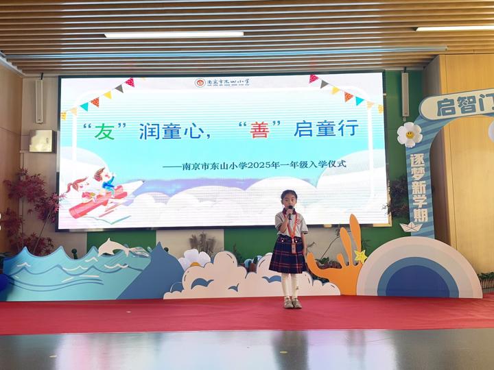 随后,全体师生共同唱响校歌《小学堂 大梦想——我是小学生啦》。大屏幕上播放着孩子们几天校园生活的点滴影像:新书包、新课本、新朋友……每一帧画面都洋溢着成长的喜悦与期待。张欣校长在致辞中表达了对孩子们的殷切期望与美好祝福,鼓励他们在东山小学这片沃土上快乐学习、茁壮成长。