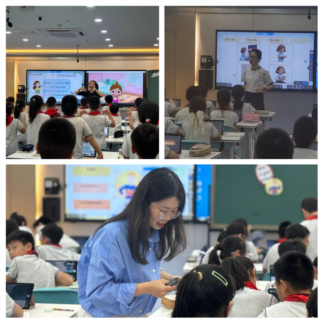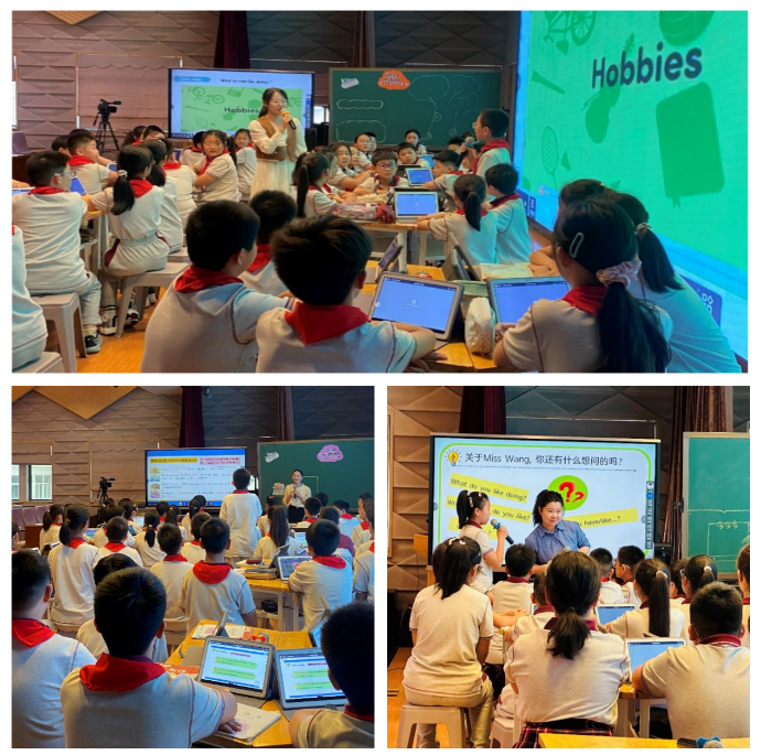 东山小学徐欣老师执教《三年级上册Unit3 Are you Su Hai?(Lead in&Cartoon time)》。利用数字人“Duo Duo”进行导入,作为课堂伴学,引导学生与新朋友交流, 呼应Big question。利用书写视频、嘴型示意让三年级学生更加扎实地掌握基础知识,更加规范地书写字母。文靖东路小学的赵珍老师执教《五年级上册Unit4 Hobbies(Story time)》。利用翻翻卡游戏,快速了解老师,并引出本课的地Big question:How can we talk about hobbies。教师通过平板推送,让学生划出关键词句、图文匹配等活动,帮助学生由浅入深地理解文本,通过观点云输入自己的想法,将课堂教给学生,让学生更好地回忆所学。南京市力学小学海德北岸分校的廖靓老师执教《五年级上册Unit 6 My e-friend(story time)》。教师通过Yes/No游戏,随机抽取学生回答,来了解老师的基本信息,引入本节课的Big question:What do you think of friends?阅读环节,教师先通过平板推送的选择题来检测学生的文本感知,继而进行分类游戏和思维导图制作,激发学生的思维能力。