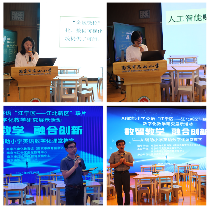 为主动应对人工智能对教育形态的重塑,深入推动AI与英语课程教学的深度融合,一场以“AI辅助小学英语数字化课堂”为主题的跨区域联合教学研讨于2025年9月29日在南京市东山小学顺利举行。本次活动汇聚了江宁区与江北新区的教研员专家和优秀教师的教学成果,紧扣国家新课标要求,依托“金陵微校”平台的技术优势,旨在通过跨区联片的新型教研机制,探索小学数字英语课堂与人工智能的创新结合点,为教师教学方式变革与数字素养提升注入新动能。
