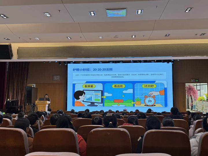 随后,区疾控中心朱老师带来专题讲座。她从眼睛的生理结构、近视的形成原因、常见表现等基础知识点切入,结合学生日常学习生活中的用眼习惯,重点讲解了科学爱眼、科学护眼的核心方法,从合理控制用眼时长、保持正确读写姿势、增加户外活动等方面给出具体建议,引导学生养成良好用眼习惯。